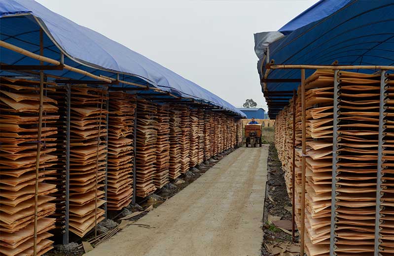 說到旋切廠,不得不提到的是怪獸木業(yè)曬板場。300畝的曬板場滿滿的都是芯板,怪獸木業(yè)的曬板場不僅曬旋切廠刨出來的板材,更多的是各個供應商提供的濕板材。每天的板材曬干收,收完再曬,重復使用無間斷。工人們每天早晚都要巡場,巡場不只為了檢查板是否曬干,更重要的是在巡查中一遍遍地挑出那些不合格的二級、三級板,保證怪獸木業(yè)模板原料的高純正性。